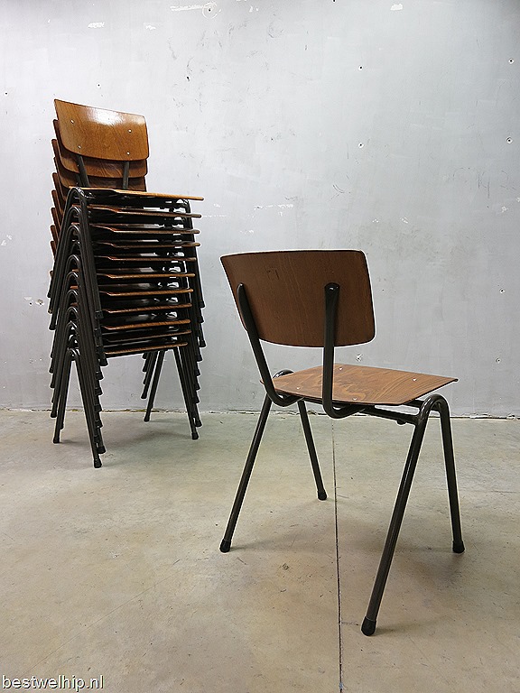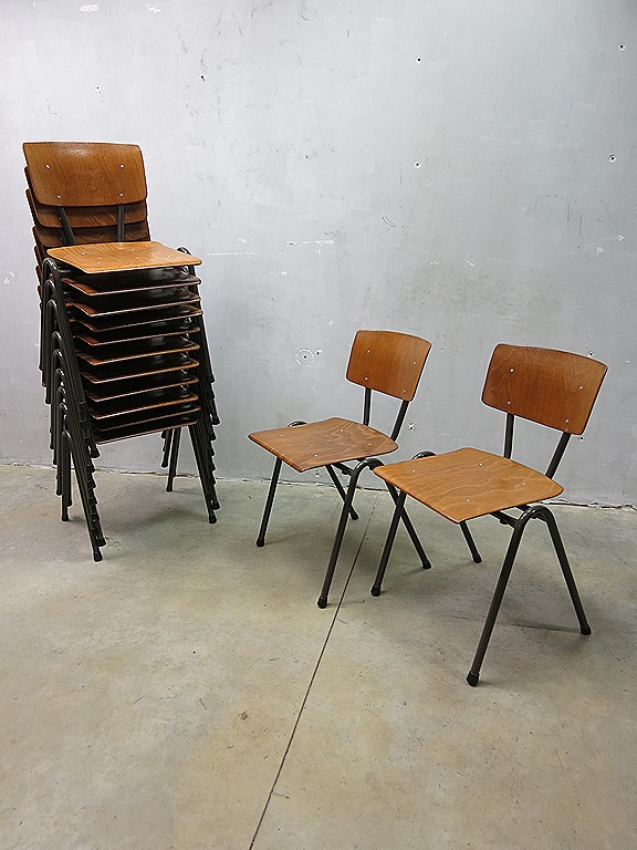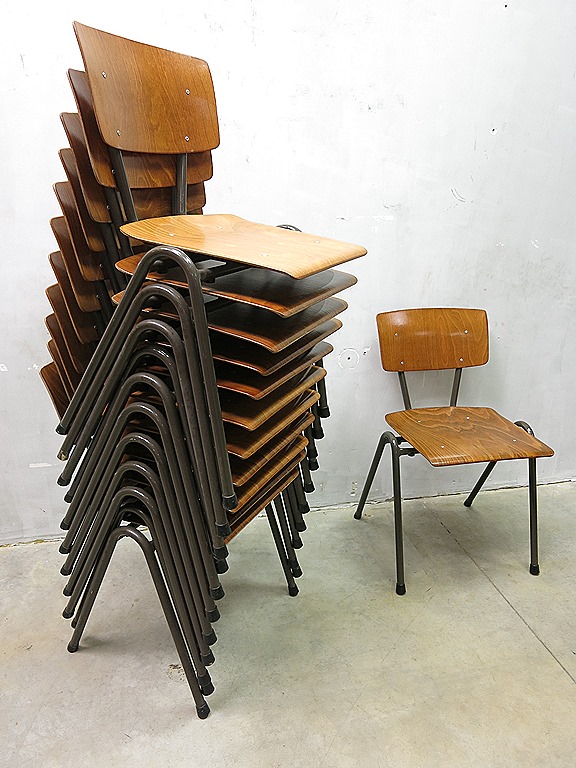 Een partij stapelstoelen, mooi van eenvoud, ze hebben ‘n strak metalen onderstel voorzien van een prachtige strakke houten zitting. Ideaal om bij te zetten aan een lange eetkamertafel en praktisch om op te bergen omdat ze stapelbaar zijn. Periode: jaren 60/70. Gezien de leeftijd nog in zeer goede vintage staat. Leuk voor thuis aan tafel maar ook interessant in deze grotere partij voor het inrichten van je restaurant, theater, kantoor of voor in een hotel. Prijs: verkocht
