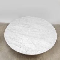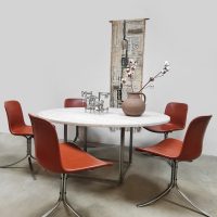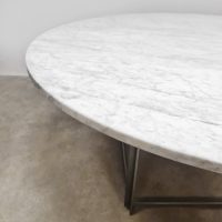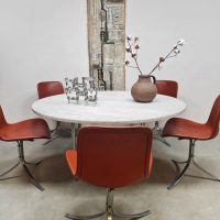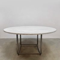 Unique find! Deze bijzondere vintage ronde eettafel past weer helemaal in low dining trend van nu. Een ontwerp van Poul Kjaerholm en geproduceerd door Fritz Hansen. Dit minimalistische design object is absoluut een must have voor de liefhebber van Deens design. De PK54 is een tijdloos design voorzien van een metalen onderstel en een marmeren blad. Het marmer komt uit Italië en heeft een prachtige adering. Het blad heeft een fraaie ruwe structuur. De combinatie van het natuurlijke materiaal marmer en het harde metaal geeft deze tafel een imposante uitstraling. Absoluut een investering in het interieur. Gezien de leeftijd in een goede conditie. Staat deze indrukwekkende tafel binnenkort in jouw interieur te stralen? Absoluut een must have!