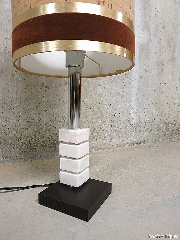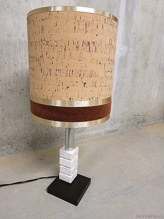 Een aparte lamp met een opvallende uitgebalanceerde vorm. Anders dan anders….deze vintage lamp oogt zeer ‘chique’ met een knipoog. Periode: jaren 60/70. Materiaal: de voet is van hout in combinatie met wit marmeren stenen (flexibel te draaien in elke gewenste positie) een chromen staander en een bijzondere kamp met een natuurlijk ‘kurk’ dessin, afgebiesd met gouden rand & bruin ‘velour’. Deze lamp is slank en stijlvol. Afmetingen: H0.57 cm en de diameter van de kap is 0.25 cm. Gezien de leeftijd nog in goede vintage staat. Zoek jij nog een bijzondere lamp ter decoratie, aankleding van je interieur? Prijs: verkocht