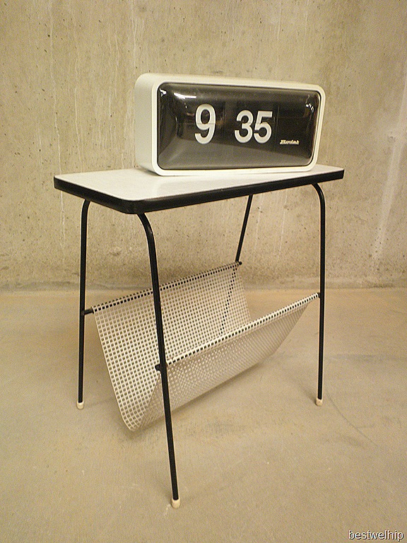 Industrieel tijdschriftenrek/ vintage design lectuurbak/bijzettafel in zwart/wit. Periode: jaren 50, jaren 60. In het metaal zijn witte vierkantjes geperforeerd, waarschijnlijk Pilastro (Holland). Materiaal: metalen mand van geperforeerd metaal, metalen poten, formica blad. Afmetingen: D20 x B48 x H48 cm. Deze krantenbak verkeert in zeer goede vintage staat, het formica blad heeft nog een mooie gave structuur. Deze lectuurbak/ bijzettafel past door zijn design zowel prachtig in een vintage- als in een modern interieur. Absoluut een mooi exemplaar voor naast de bank. Prijs: verkocht