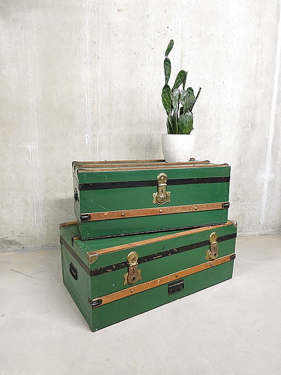 Deze prachtige industriële vintage koffers zijn ooit gebruikt voor verre reizen en nu opweg naar een nieuwe bestemming… Ideaal als smaakvolle ‘opberger’, ter decoratie of om als bijzettafel/ salontafel te gebruiken. Periode: jaren 30/40. Kleur: midden groen. Deze kist is in zeer goede vintage staat met stoere authentieke details. De zijkanten zijn voorzien van metalen handgrepen en afgewerkt met houten biezen, een messing slot en de kist is volledig bekleed met een groen metaal beslag. Verkrijgbaar in een groter (B0.90 x D0.48 x H0.36 cm) en kleiner exemplaar (B0.80 x D0.45 x H0.33) ‘De kist’ is een van de meest handigste en decoratiefste opbergruimtes in huis…multifunctioneel inzetbaar van handig opbergkoffer tot stoere industriële bijzet/salon tafel. Een object wat zijn leven lang meegaat en echt niet weggegooid kan worden! Geef dit koffer een nieuw ‘leven’ en het zorgt voor een authentieke en stoere sfeer in huis. Prijs: verkocht