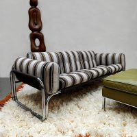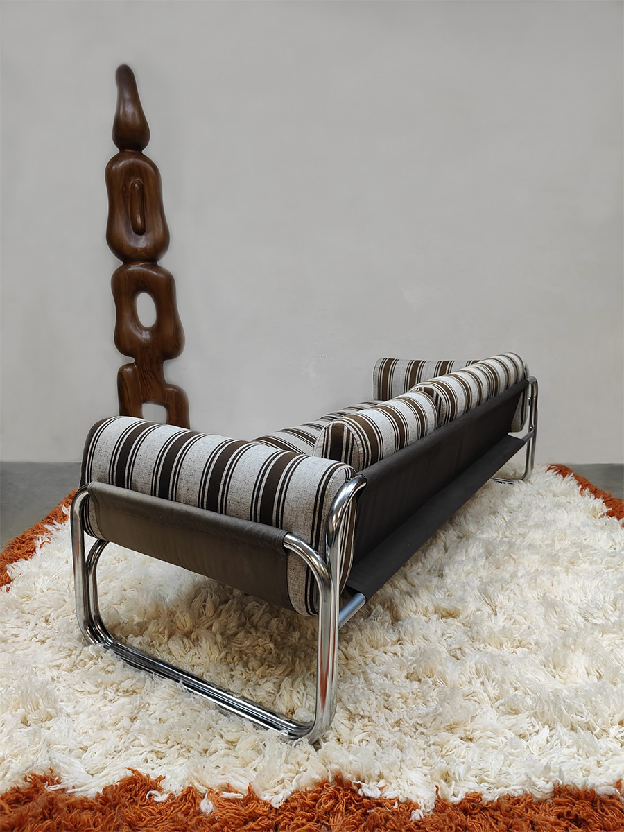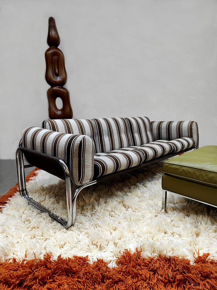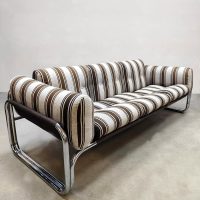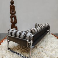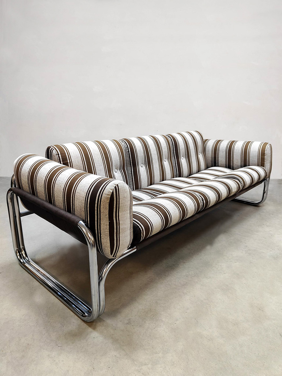 Absoluut een uniek exemplaar! Deze te gekke vintage design 3 zits sofa is net ff anders dan anders. Periode: jaren 70. Nog voorzien van originele two tone stripe kussens en een prachtig chromen buizenframe. Gezien de leeftijd nog in een goede vintage staat. Lounge time it is! Weet deze midcentury design bank een plekje te veroveren bij jou in in huis?