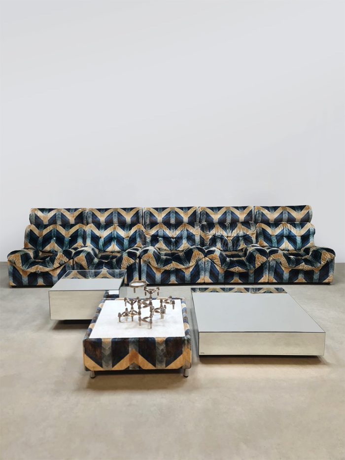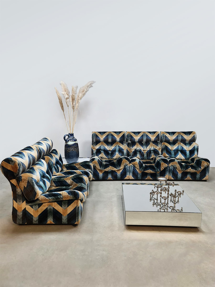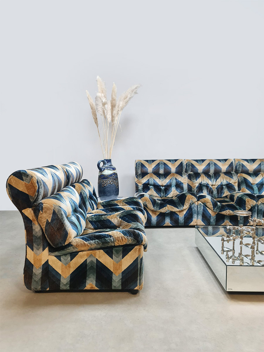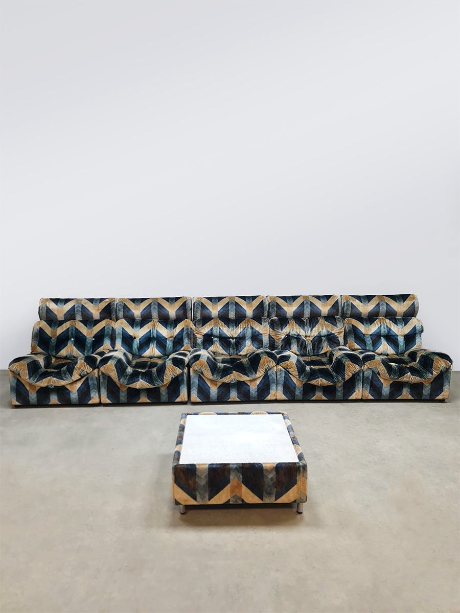 Blue spirit & geometric lines! Wat een eye-catcher deze unieke vintage design modulaire lounge sofa. Nog voorzien van originele velours stof in geometrisch patroon. Periode: jaren 1970. Land van herkomst: Frankrijk. Deze modulaire elementenbank bestaat uit vijf losse zit elementen en 1 bijbehorende salontafel. De originele bekleding in zachte velours straalt elegantie en karakter uit. Een absolute blikvanger voor de living of voor in de lobby van je hotel of restaurant. Gezien de leeftijd nog in een goede vintage staat. Staat dit bijzondere exemplaar binnenkort bij jouw thuis te shinen? Relax and recharge in style.