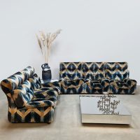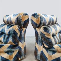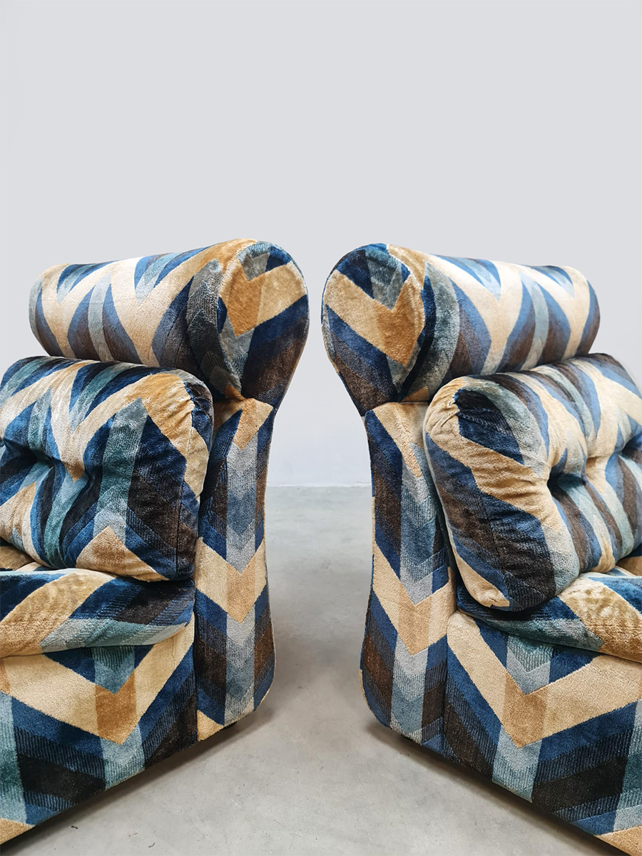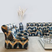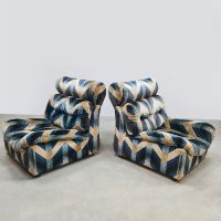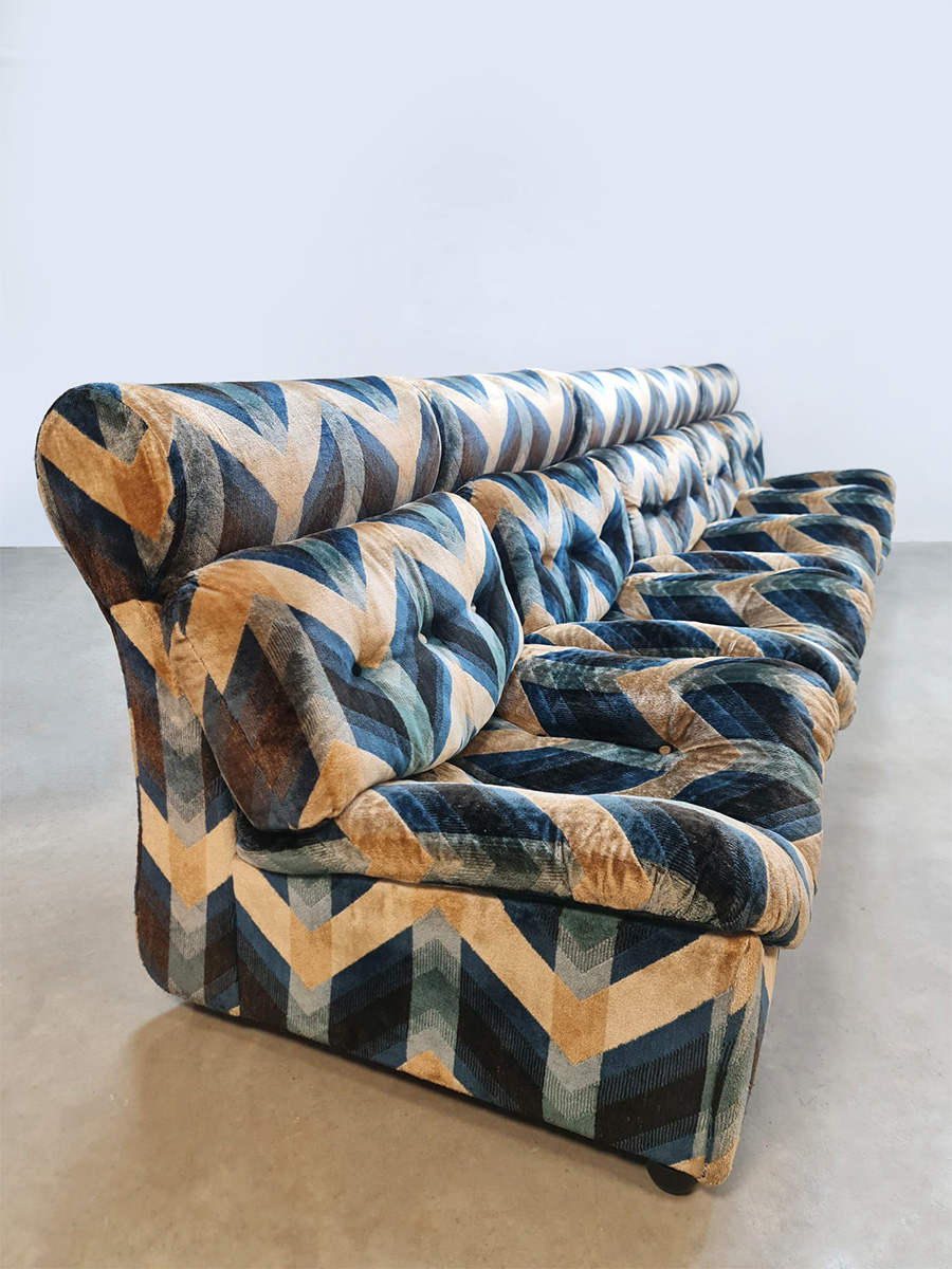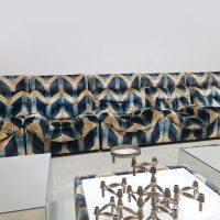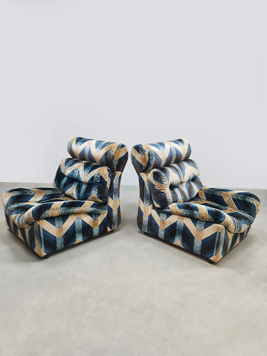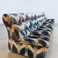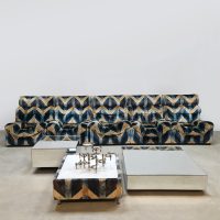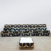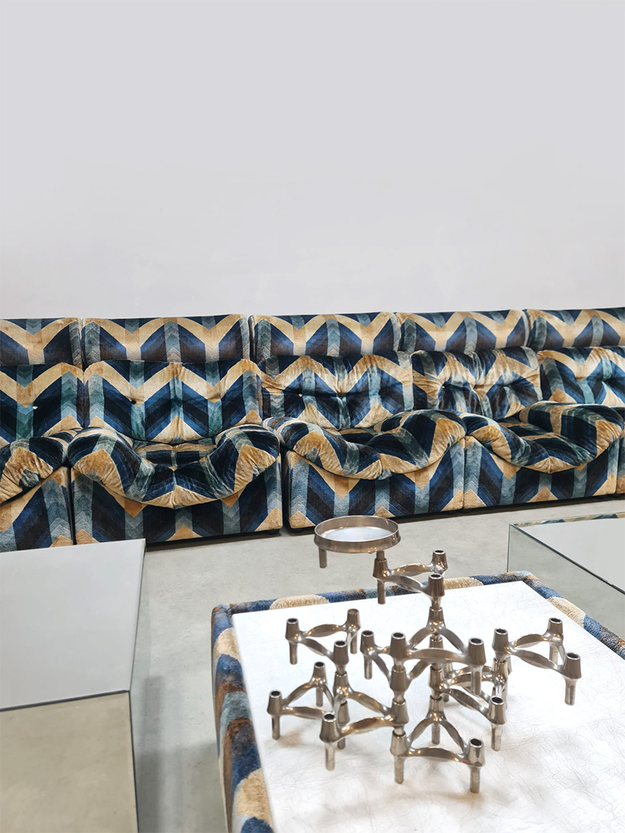 Blue spirit & geometric lines! Wat een eye-catcher deze unieke vintage design modulaire lounge sofa. Nog voorzien van originele velours stof in geometrisch patroon. Periode: jaren 1970. Land van herkomst: Frankrijk. Deze modulaire elementenbank bestaat uit vijf losse zit elementen en 1 bijbehorende salontafel. De originele bekleding in zachte velours straalt elegantie en karakter uit. Een absolute blikvanger voor de living of voor in de lobby van je hotel of restaurant. Gezien de leeftijd nog in een goede vintage staat. Staat dit bijzondere exemplaar binnenkort bij jouw thuis te shinen? Relax and recharge in style.