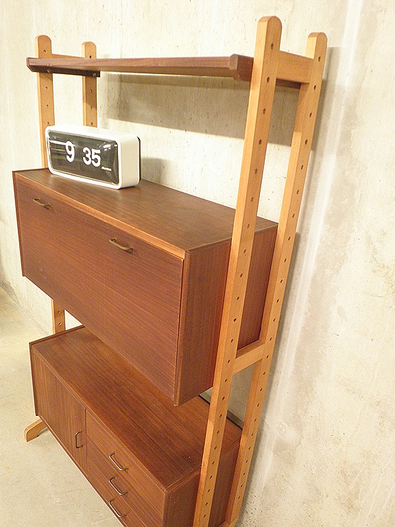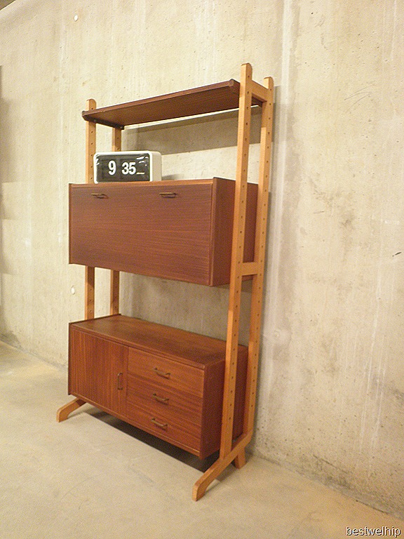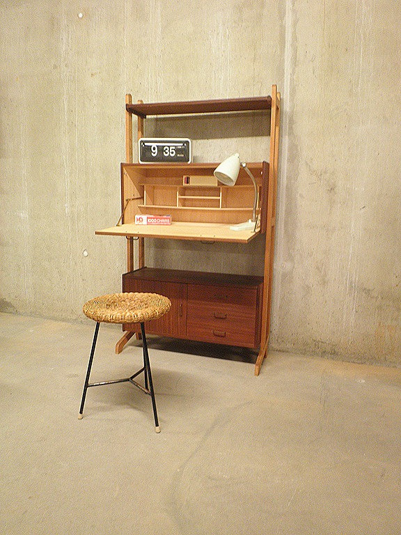 Leuk wandsysteem ontworpen in de jaren 50, Deense stijl. Dit wandmeubel is opgebouwd uit 2 staanders met onderop een opbergkast voorzien van 3 lades en 1 deur met daar boven een klep eventueel te gebruiken als bureau/secretaire. Materiaal: hout (teak fineer) Het wandsysteem lijkt op Louis van Teeffelen voor Webe en is waarschijnlijk van Hollandse makelij. Afmetingen: H1.50 x B0.85 x D0.36 cm, bureauhoogte 74 cm ( van grond tot onderkant blad) Als het is opengeklapt is de diepte van het blad 33 cm en de totale diepte van het blad 61 cm. Gezien de leeftijd nog in goede vintage staat ( enkel de bovenste plank vertoont enige fineer beschadiging) Ideaal om aan te werken met je laptop of te gebruiken als wandkast/ ‘bar’ kast. Prijs: verkocht