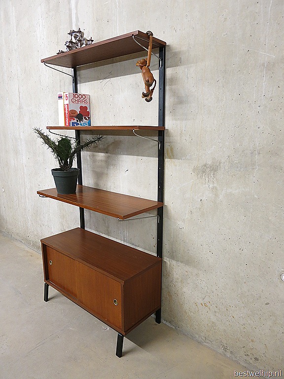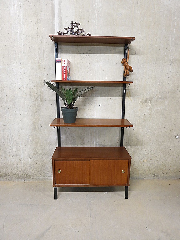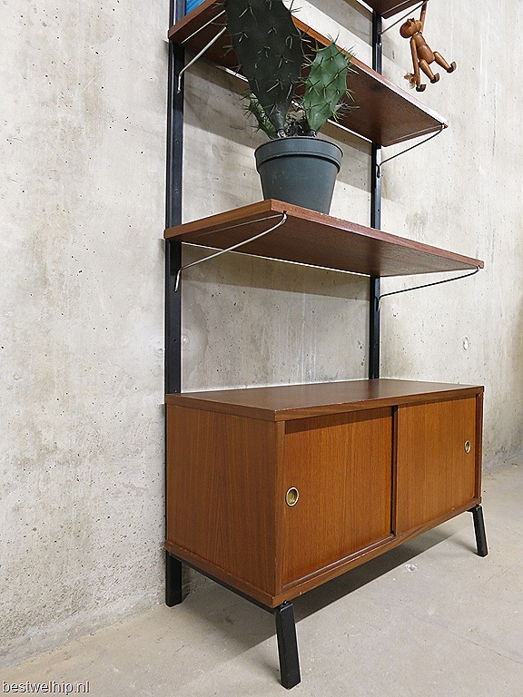 Strakke vintage design wandkast/ boekenkast. Ontwerper: onbekend (doet denken aan een van de eerste vrijstaande wandsystemen die Poul Cadovius op de markt heeft gebracht) Periode: jaren 60, Mid Century design. Materiaal: voorzien van houten legplanken en een houten kast met schuifdeuren, zwart metalen wandbeugels. Bijzonder door zijn beperkte afmetingen, extra low. H1.57 x B0.76 x D0.32 (onderkant) x D0.22 (bovenkant) Gezien de leeftijd in goed gebruikte vintage staat ( minimale vintage sporen aan 1 plank ) Stoer voor aan de wand in de kamer. Prijs: verkocht
