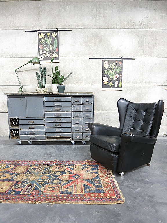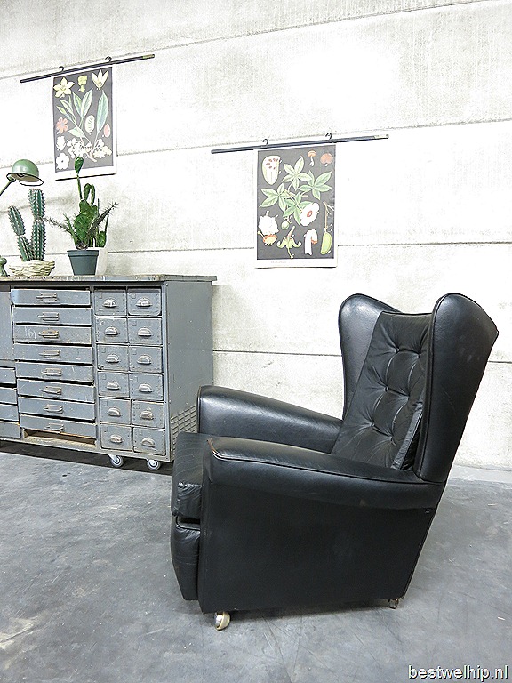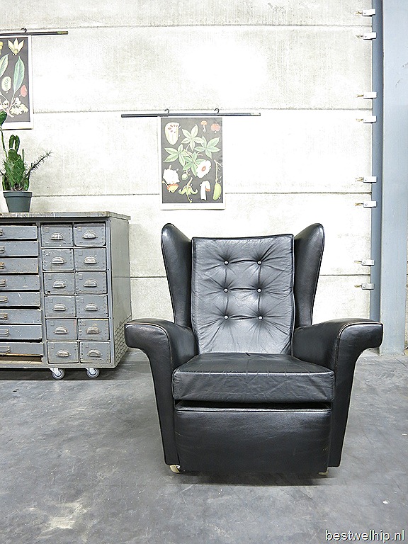 Prachtige grote relax fauteuil met een heerlijke comfortabele zit. Ook wel oor-fauteuil oftewel Wingback chair genoemd. Periode: jaren 50/60. Materiaal: zwarte leren bekleding en chromen piano wielen. Een stoer exemplaar! Gezien zijn leeftijd nog in zeer goede vintage staat. Absoluut een bijzondere lounge stoel met een zeer comfortabele zit. Prachtig in zowel een vintage als modern interieur. Mooi door zijn eenvoud en strakke vormen. Neem plaats in deze vintage relax fauteuil en je wil nooit meer opstaan…Waan je helemaal in de Mad-men stijl!