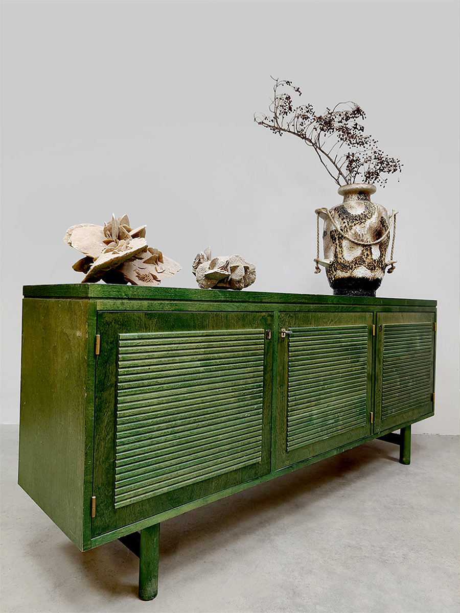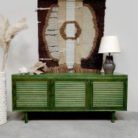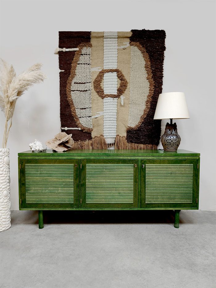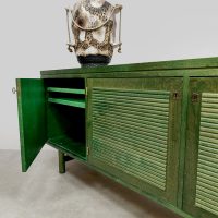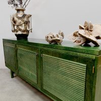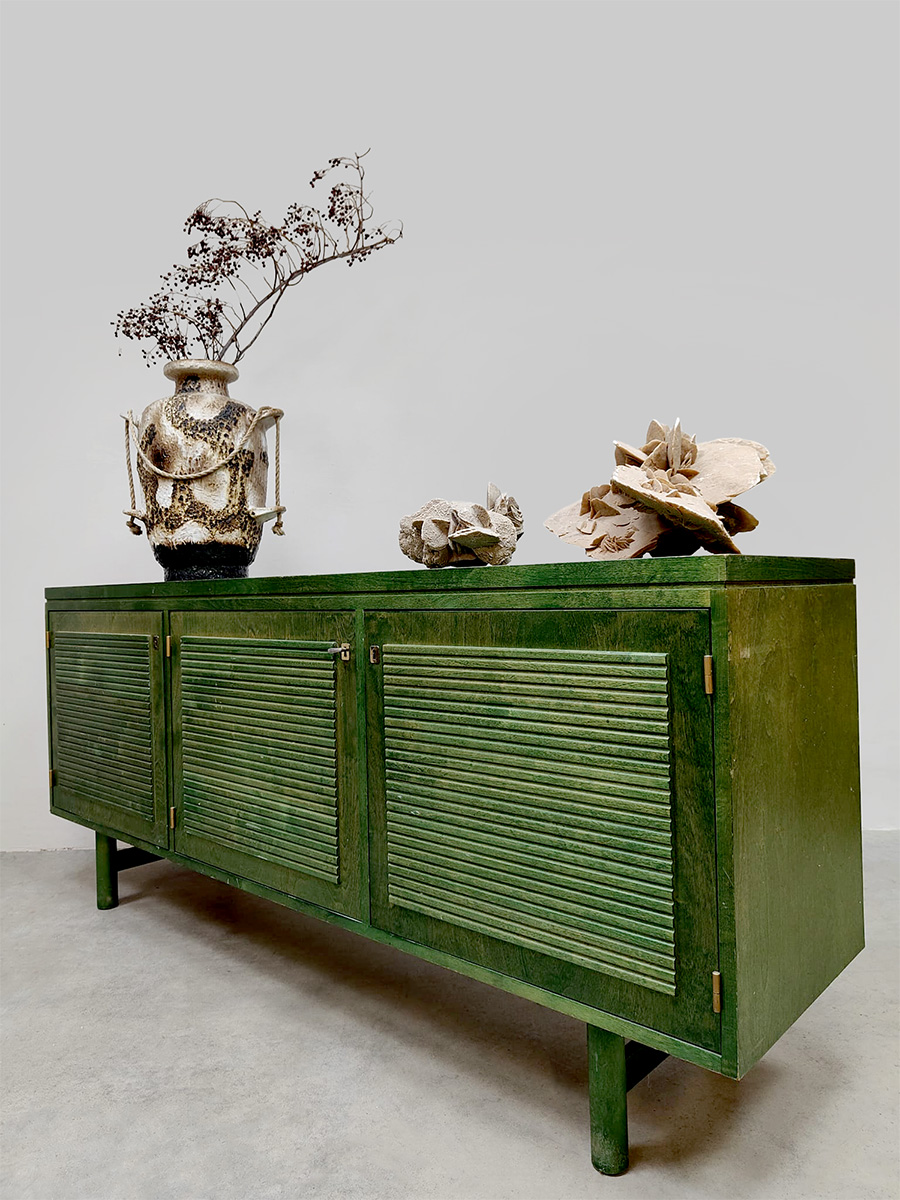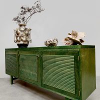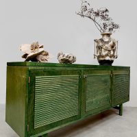 Haal buiten naar binnen met dit kleurrijke originele vintage groene sideboard/ cabinet. Periode: jaren 70. Land van herkomst: Finland. Producent: Asko. Voorzien van 3 klapdeuren met daarachter veel opbergmogelijkheid. Gezien de leeftijd nog in een goede originele vintage staat. Net even anders dan anders, dare to be different! Krijgt dit exemplaar straks een mooie plek bij jou in huis. We love it, jij ook? Green spirit!