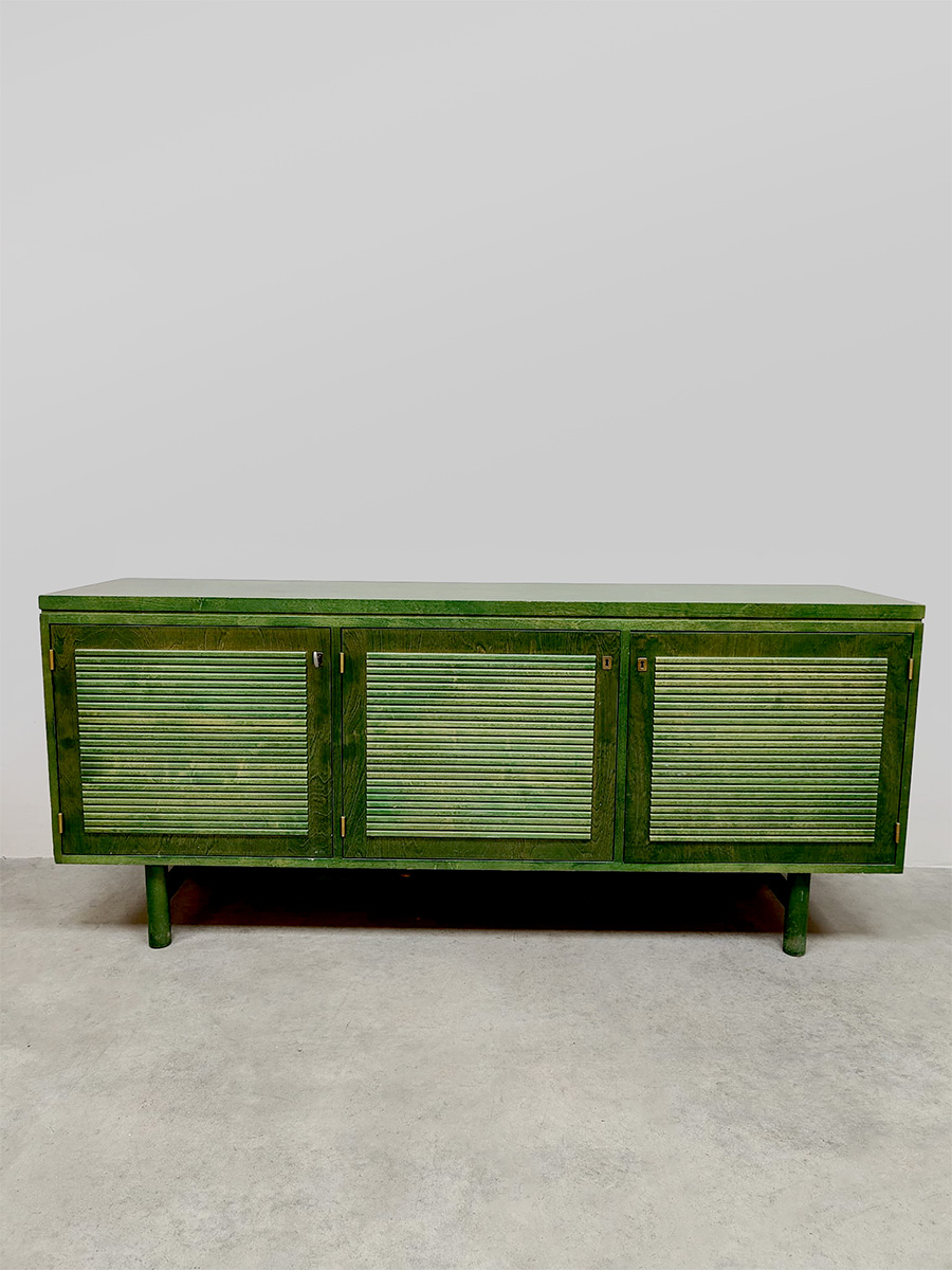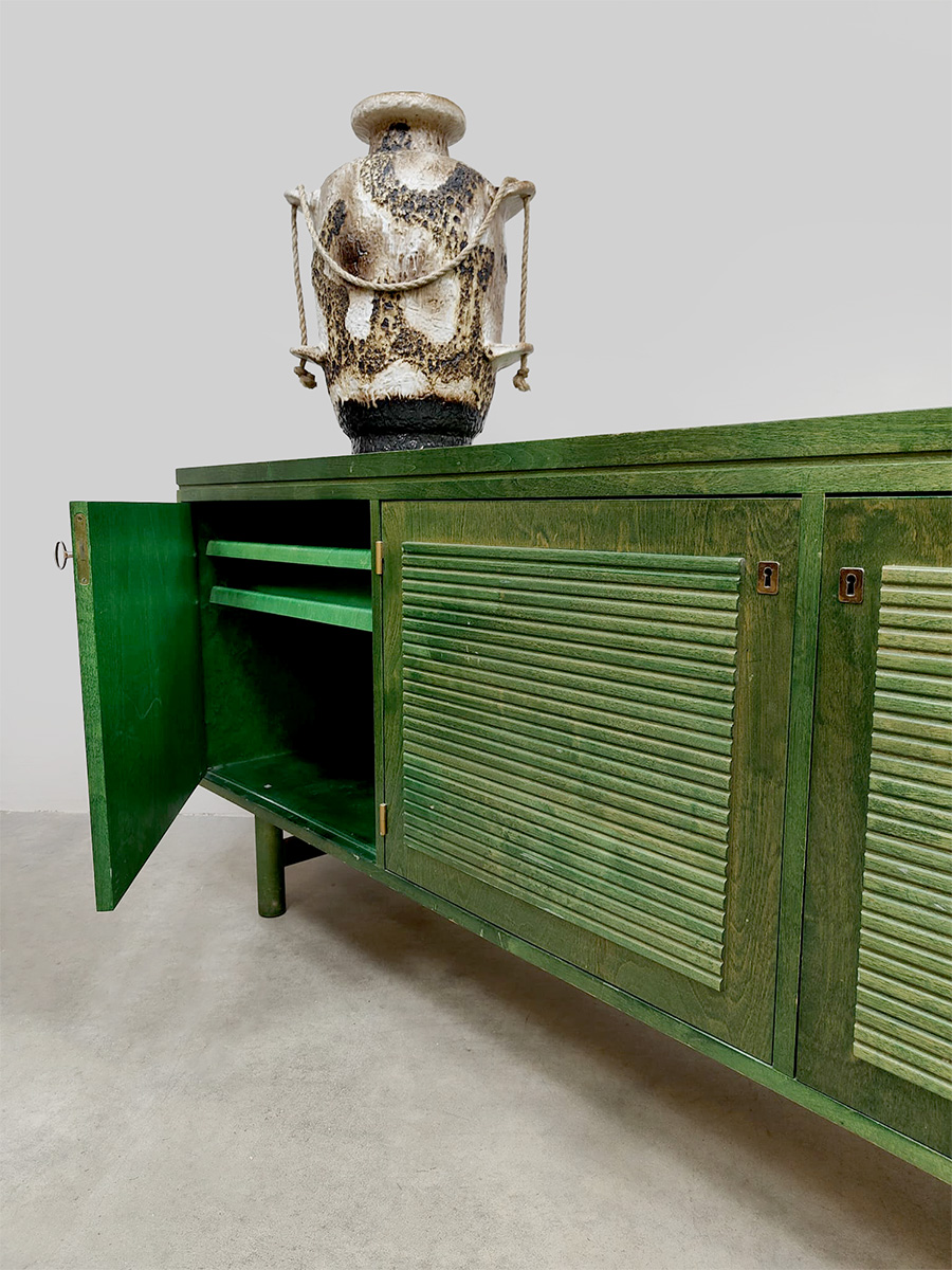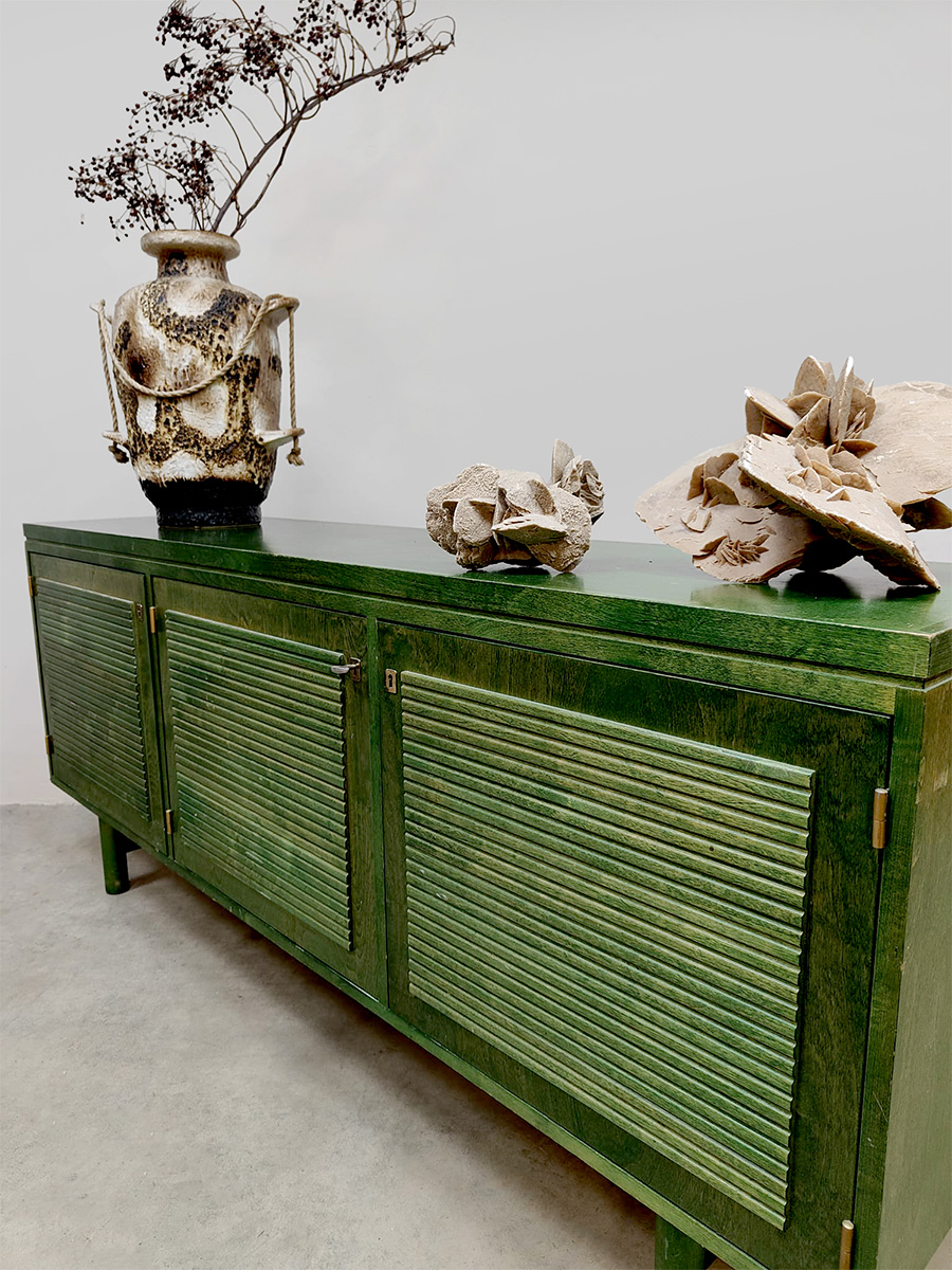 Haal buiten naar binnen met dit kleurrijke originele vintage groene sideboard/ cabinet. Periode: jaren 70. Land van herkomst: Finland. Producent: Asko. Voorzien van 3 klapdeuren met daarachter veel opbergmogelijkheid. Gezien de leeftijd nog in een goede originele vintage staat. Net even anders dan anders, dare to be different! Krijgt dit exemplaar straks een mooie plek bij jou in huis. We love it, jij ook? Green spirit!