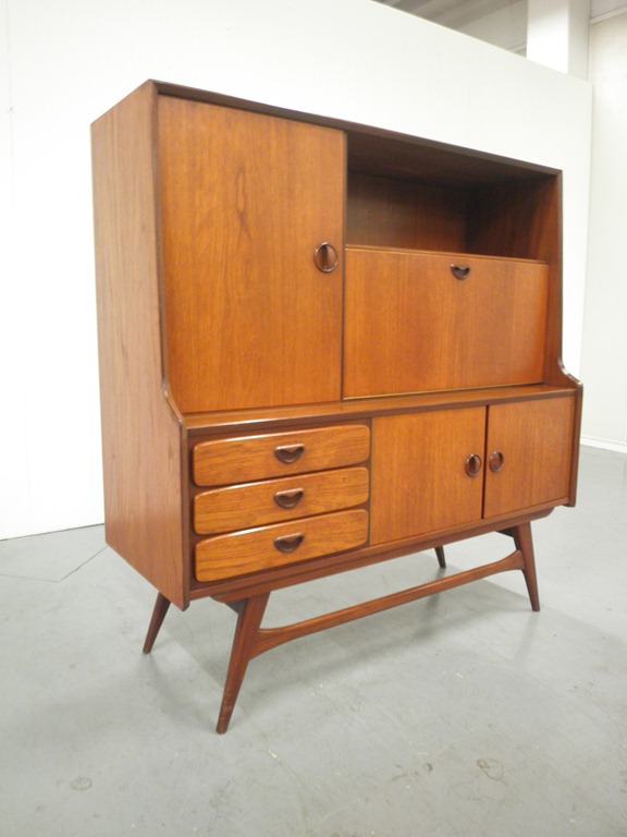 Vintage dutch design kast van Webe, ontworpen door Louis van Teeffelen. Zeer bijzonder exemplaar in Scandinavische stijl. Kenmerkende en mooie afwerkingen in de handgrepen en hoge ranke poten. Voorzien van 3 lades, een legkast, een barkast met glasplaat en een secretaire klep. Als secretaire uitklapt een ideale werkhoogte om met je laptop aan te werken. Periode: 1960. Materiaal: teak hout. Bescheiden afmetingen: B1.30 x H1.34 x D0.48 cm. Gezien zijn leeftijd nog in goede vintage staat ( 1 vintage plekje links voor) Absoluut in pronkstuk in je living of showroom. Prijs: verkocht