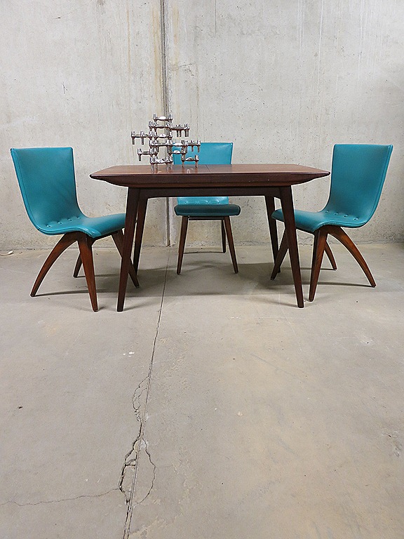 Prachtige vintage tafel uit de jaren 50, een ontwerp van Louis van Teeffelen voor Webé (Walraven & Bevers) meubelen. De tafel is gemaakt van warm massief teakhout en heeft mooie organische vormen. In één handomdraai te verlengen zodat deze geschikt is voor meerdere personen. De tafel is nog in prachtige vintage staat. Afmetingen: B1.20 x H0.74 x D0.74 cm, uitgeklapt is de tafel 1.58 cm. Ben jij die Webe liefhebber die deze bijzondere tafel niet aan je voorbij wil laten gaan? Prijs:verkocht Vier bijzonder fraai vormgegeven vintage eetkamerstoelen van de Meubelfabrikant C.J van Os. Prijs: verkocht