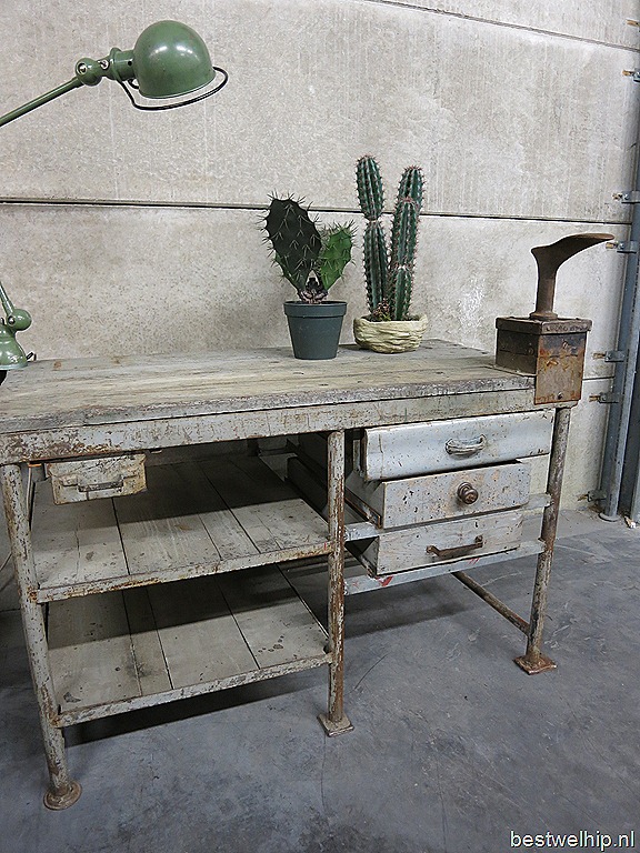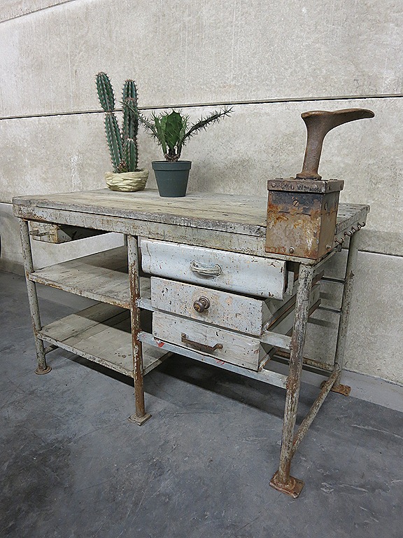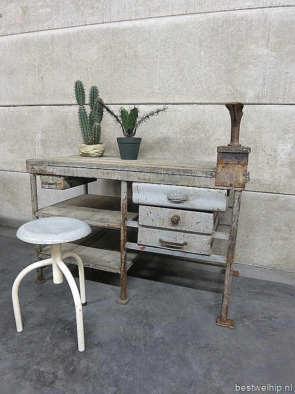 Uniek stoer industrieel bureau, werkbank, tafel uit Frankrijk. Periode: jaren 50. Metalen onderstel & lades, dik doorleefd stoer houten blad. Nog voorzien van een authentieke metalen schoenleest. Afkomstig uit een oude schoenen fabriek in Frankrijk. Door zijn bescheiden afmetingen makkelijk te plaatsen. Afmetingen: B122 x H78 x D63 cm. Stoer om te gebruiken als bijzettafel in de keuken, kamer of als presentatie tafel/ display in een (schoenen)winkel, you name it…! In ieder geval ‘one of a kind’. Prijs: verkocht