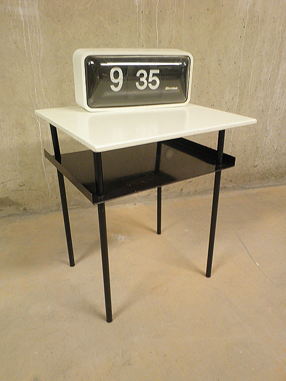 Een vooruitstrevend minimalistisch ontwerp door Wim Rietveld voor Auping, begin jaren 50. Voor die tijd een zeer modernistisch ontwerp, een bijzonder combi tussen het houten blad en metalen onderstel. Afmetingen: B42 x D37 x H51 cm. Nog in zeer goede staat. Het blad is wel ooit opnieuw geschilderd. Door zijn beperkte afmetingen makkelijk overal bij te zetten. Prijs: verkocht