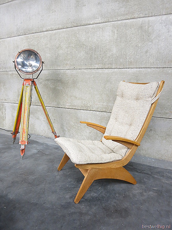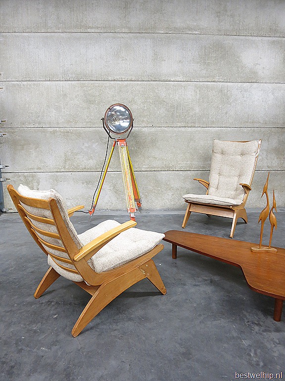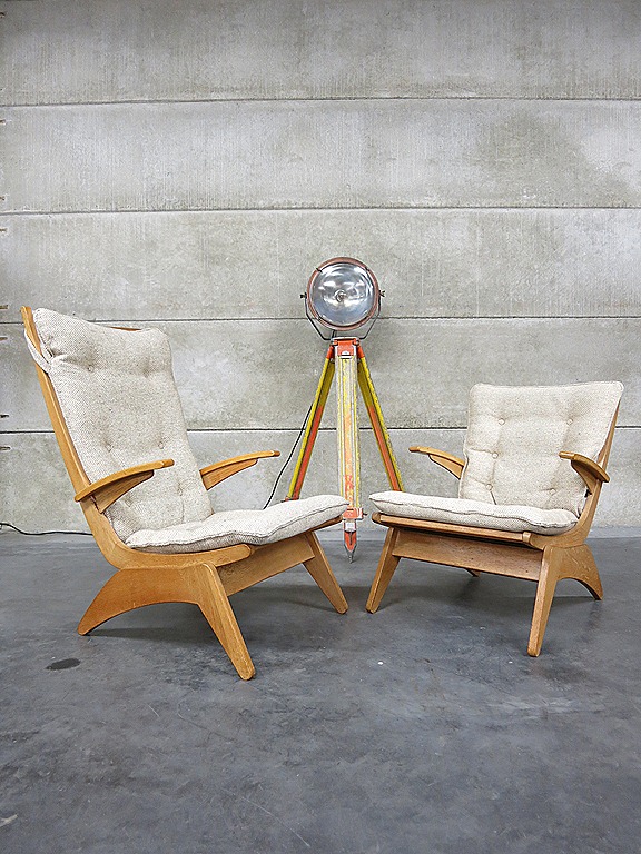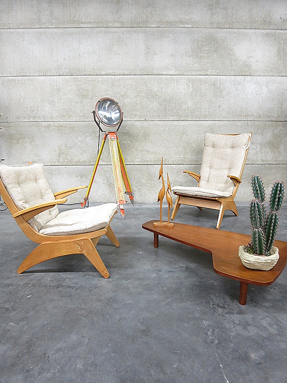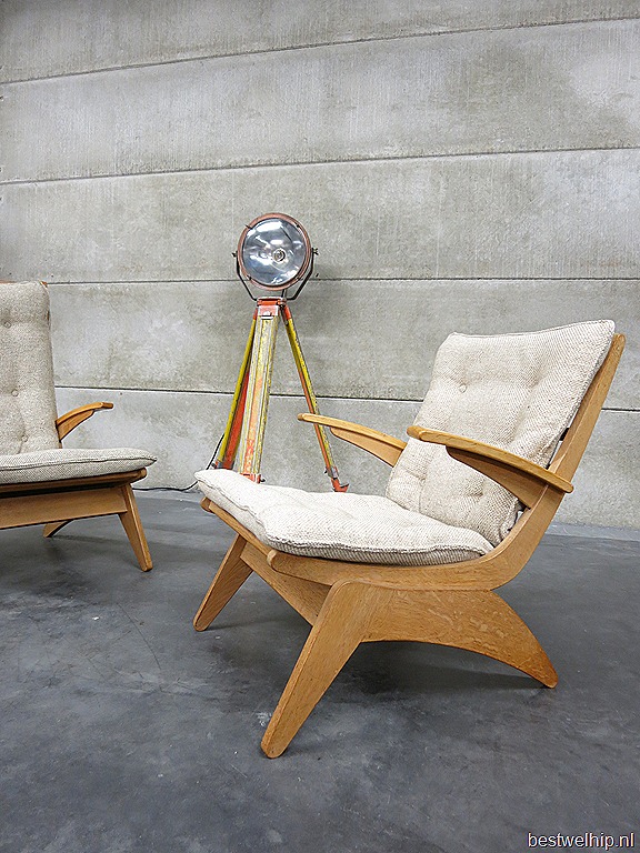 Twee unieke, zeldzame easy chairs/ armchairs, een ontwerp van Jan den Drijver voor Gelderland Holland. Periode: jaren 50. Jan Den Drijver had vroeger een meubel zaak ‘De stijl’ in Den Haag. Bijzonder mooi vormgegeven door zijn schuine lijnen. Nog voorzien van originele bekleding in ecru kleur. Afmetingen: zithoogte 37 cm. Gezien de leeftijd nog in goede vintage staat. Staan deze twee unicums straks bij jouw in de living te pronken?