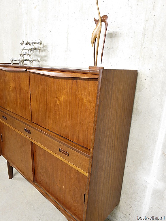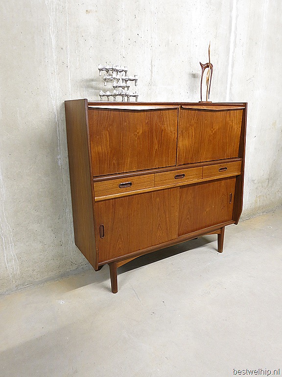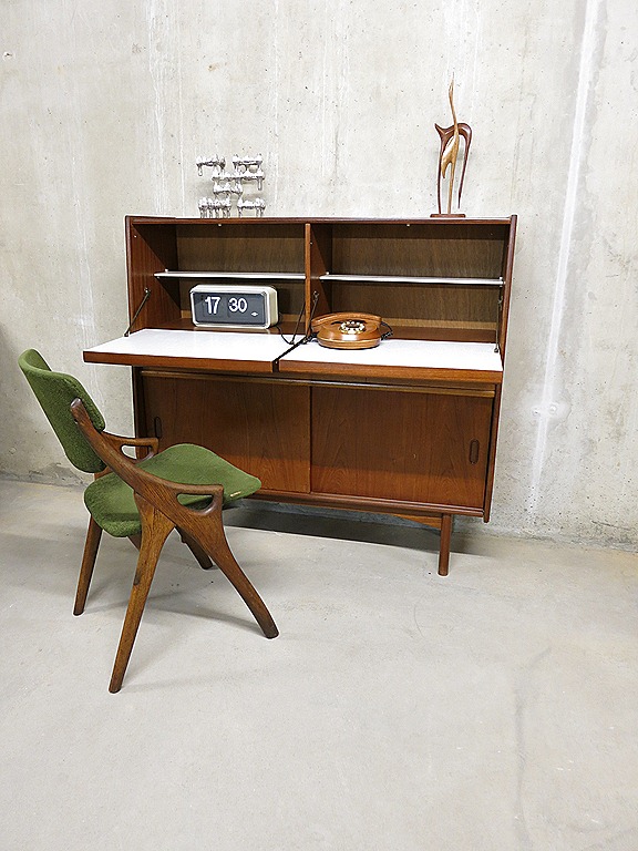 Bijzonder vintage design secretaire uit Scandinavië. Ontwerper: onbekend dit wandmeubel doet denken aan Nils Jonsson. Periode: 1950/60. Prachtig vormgegeven, met zeer bijzondere details zoals de stijlvolle organische handvaten/ handgrepen en conisch gevormde poten. Het heeft een mooie houtstructuur. Dit bureau heeft 3 ruime lades, 2 uitklapbare werk bladen met daarboven een opbergruimte. Materiaal: uitgevoerd in teakhout. Afmetingen: B1.24 x H1.19 x D40 cm, uitgeklapt D 67 cm. In goede vintage staat. Ben jij al tijden opzoek naar dit unieke exemplaar? Prijs: verkocht