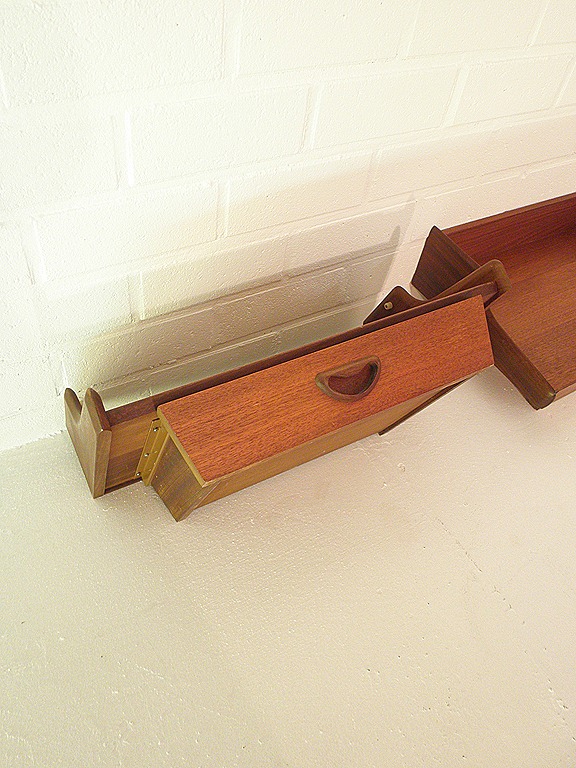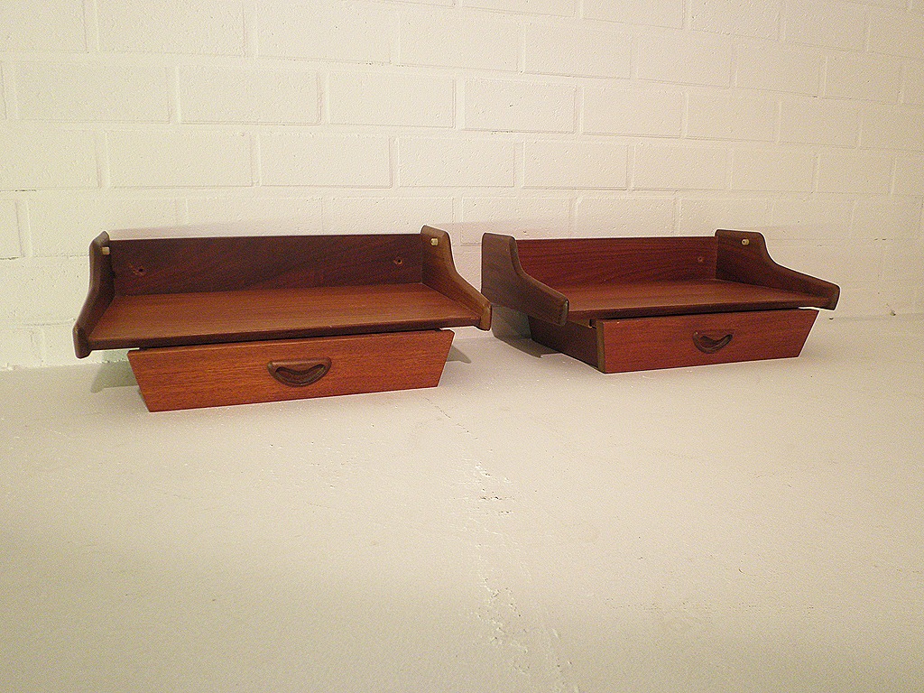2 prachtige ‘zwevende’ nachtkastjes, Deens design van Louis van Teeffelen voor Webe. De achterkant is voorzien van het Webe label. Voorzien van een schuiflade met prachtig kenmerkend handgreep. Periode: 1960. Materiaal: teakhout. Afmetingen: B50,5 x D32 x H18 cm. Ook prachtig om ze boven elkaar te hangen als ´zwevende´ boekenplank. In zeer goede vintage staat ( mogelijkheid voor glasplaatje aan de bovenkant deze ontbreekt) Een zeer stijlvolle, aparte en bovenal zeldzame set! Prijs: verkocht